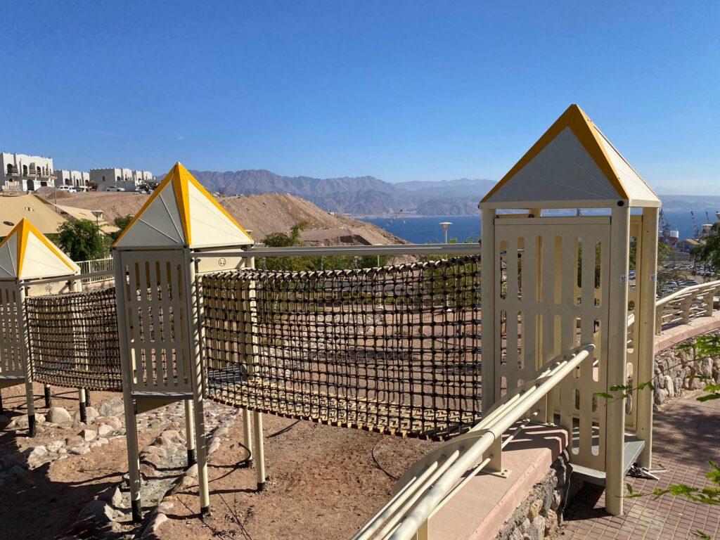 Bridge to Adventure is a playground uniquely designed to merge play with the natural landscape. At the base of the park flows an uncovered streambed, creating a natural height difference of up to 1.5 meters between its two sides. Rather than altering the terrain, the design embraces it—connecting both sides with an impressive 16.77-meter (55-foot) play bridge. Featuring five tower platforms along the way, the bridge transforms a simple crossing into an unforgettable play experience, where children move above rocky ground while surrounded by nature and breathtaking views of the Red Sea.