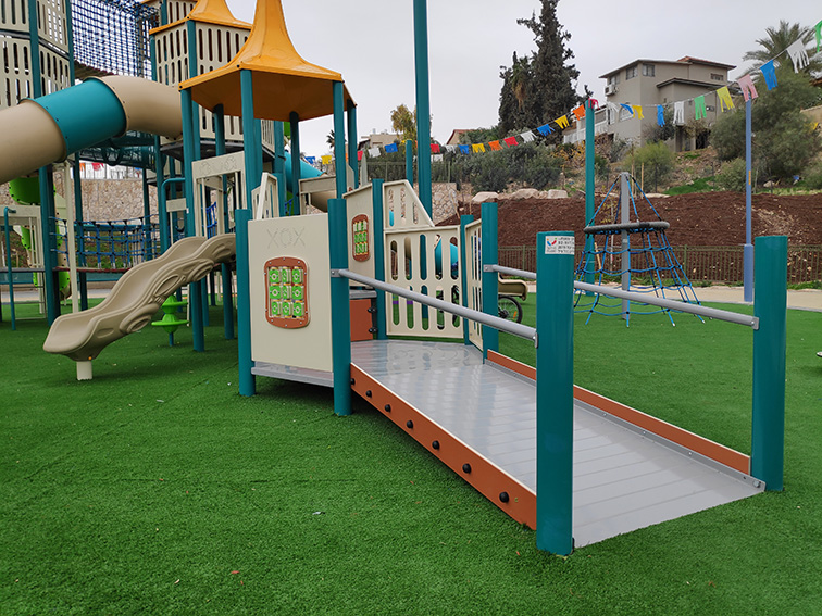 This impressive playground was designed to create a world of adventure where children of all ages can explore, challenge themselves, and let their imaginations run free. At the heart of the project stands the magnificent “Metzada” castle—a large, multi-level play structure featuring seven interconnected towers. Each tower is linked by bridges, climbing routes, and slides, forming a continuous journey of movement, excitement, and discovery. The design thoughtfully incorporates a wheelchair-accessible ramp, ensuring that children of all abilities can enjoy the full experience and feel part of the fun.