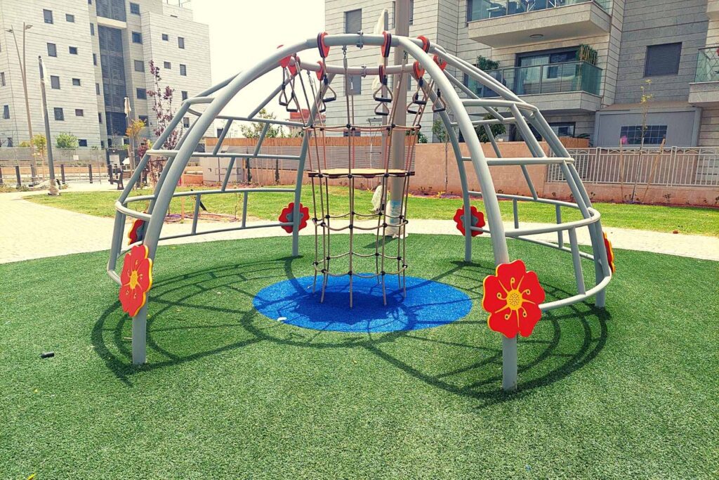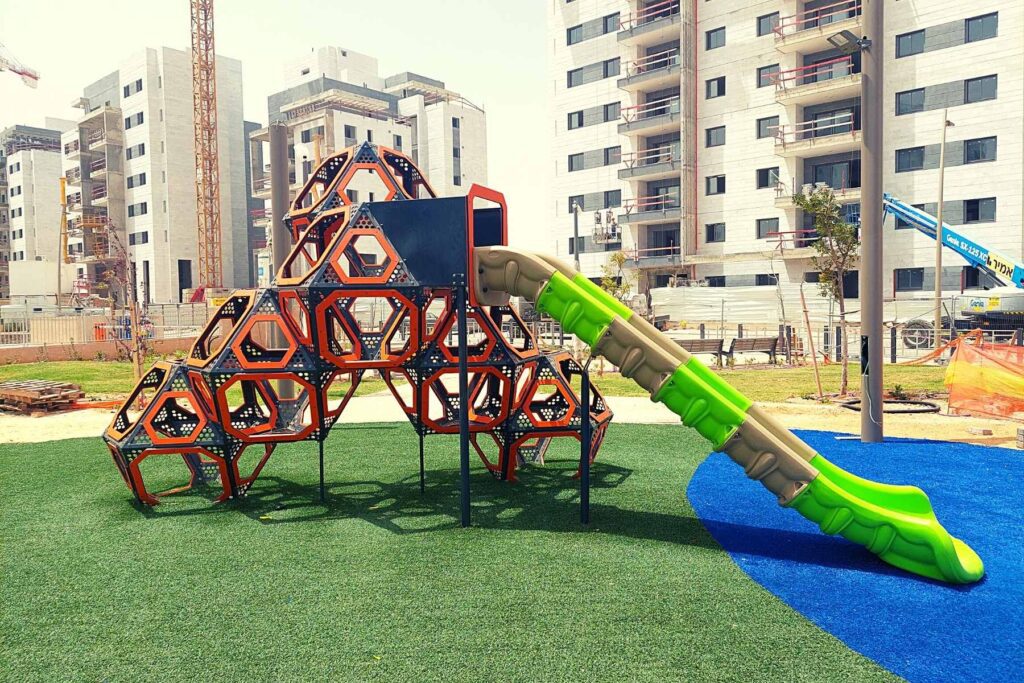The playground features several unique climbing structures, each designed to inspire confidence and encourage physical movement. The Shaldag tower is a three-meter-high climbing cube with hollow faces that allow children to move freely inside and outside before sliding back down. Nearby, the Karakal dome offers a blend of rope climbing, hand-over-hand bars, and long-distance communication through playful voice-transmitting flowers. Additional structures like Noa, a multi-level inclusive play unit, and Lihi, a colorful tree-top-themed play system, combine slides, bridges, staircases, musical panels, and climbing features to create diverse play experiences for large groups. Together, they form a vibrant world of imagination, problem-solving, and cooperative play.
