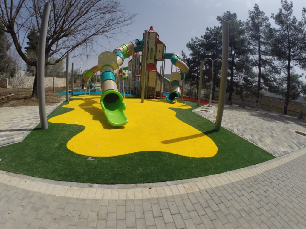The second zone introduces the “Goshrim” fitness trail—an outdoor challenge course designed for teens and adults. With multiple stations targeting different muscle groups, the trail encourages strength, balance, and coordination through active movement. Completing the experience is a dedicated Pumptrack area, featuring a dynamic bike trail with rolling ups and downs that deliver speed, flow, and adventure. Together, these zones transform the playground into a multifunctional destination that supports play, fitness, and outdoor activity for all ages.