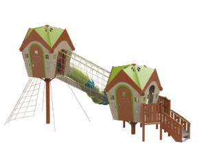 At the heart of the playground stands the “Land of Oz” treehouse model, a unique centerpiece that combines accessibility with adventure. The design includes a small, low house that is easily accessible for toddlers and inclusive for all children, alongside a taller treehouse featuring a rope climbing net and a long, thrilling slide. Connecting the two structures is a high cable bridge—spacious enough for adults to walk through upright—creating a shared play experience that truly spans generations.