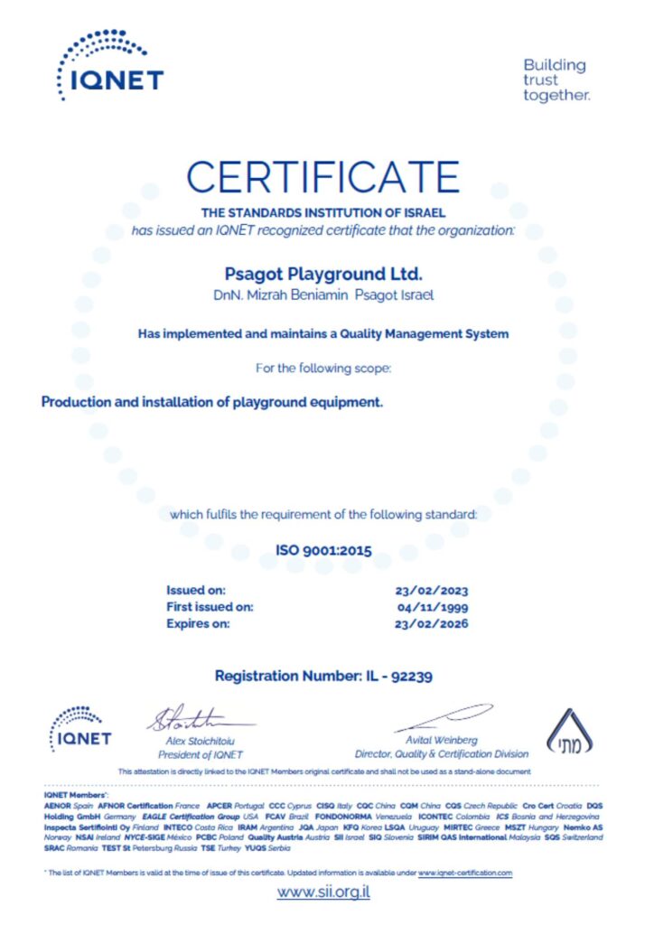 In addition to safety, accessibility is a core value of our design philosophy. Our inclusive playground equipment meets ADA (Americans with Disabilities Act) requirements, allowing children of all abilities to play together. We also comply with European Standard EN 1176 and Israeli Standard 1498, which is based on EN 1176. These certifications reflect our commitment to building playgrounds that are safe, accessible, and trusted by municipalities, architects, and communities worldwide.