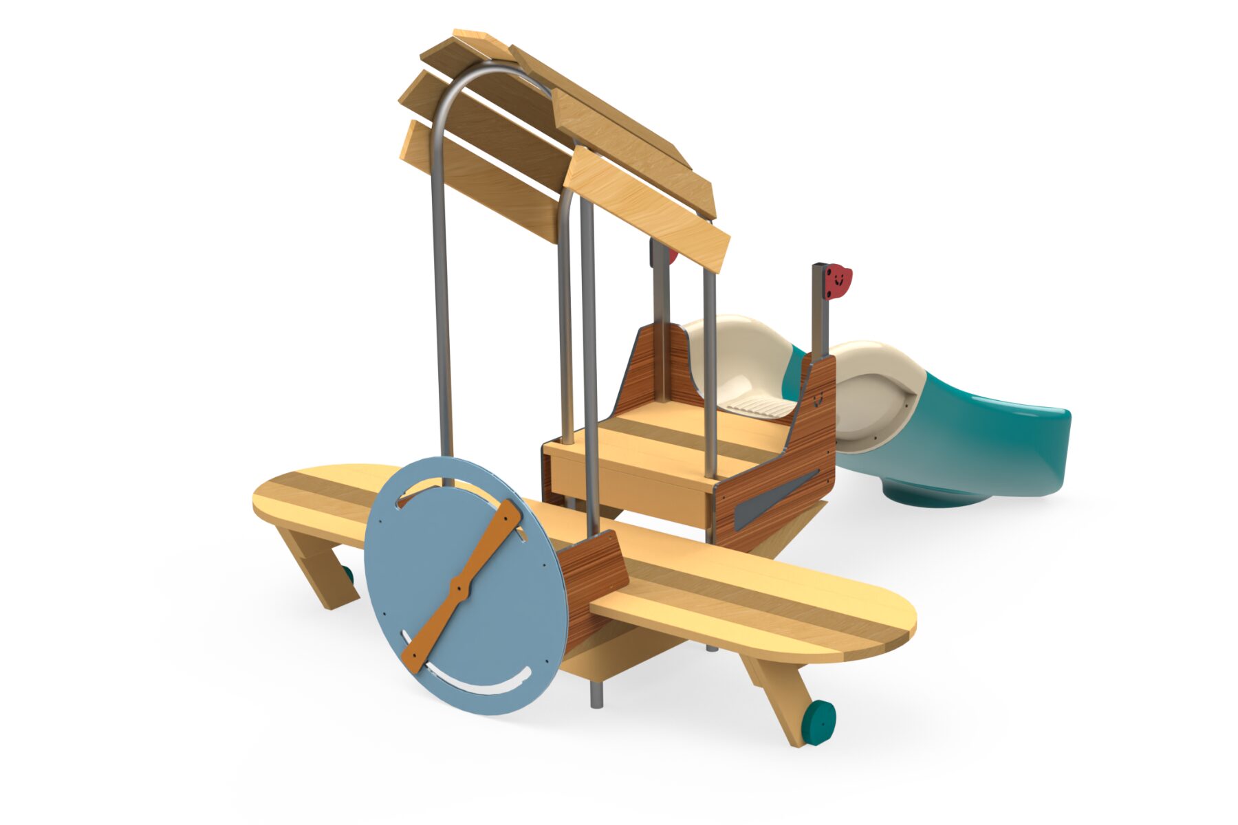 The Aardvark toddler airplane is made from natural European Robinia Wood and features a stainless-steel 316 construction, giving it high durability alongside an attractive appearance. The system includes design elements such as a rounded roof, plastic chain slide, and a decorative propeller that mimics the flying experience. The play surfaces, shaped like wings, allow children to imagine they are pilots, jumping and playing while developing creativity and imagination. The system is carefully designed to provide a diverse and safe play experience for toddlers, combining physical activity with imaginative play.