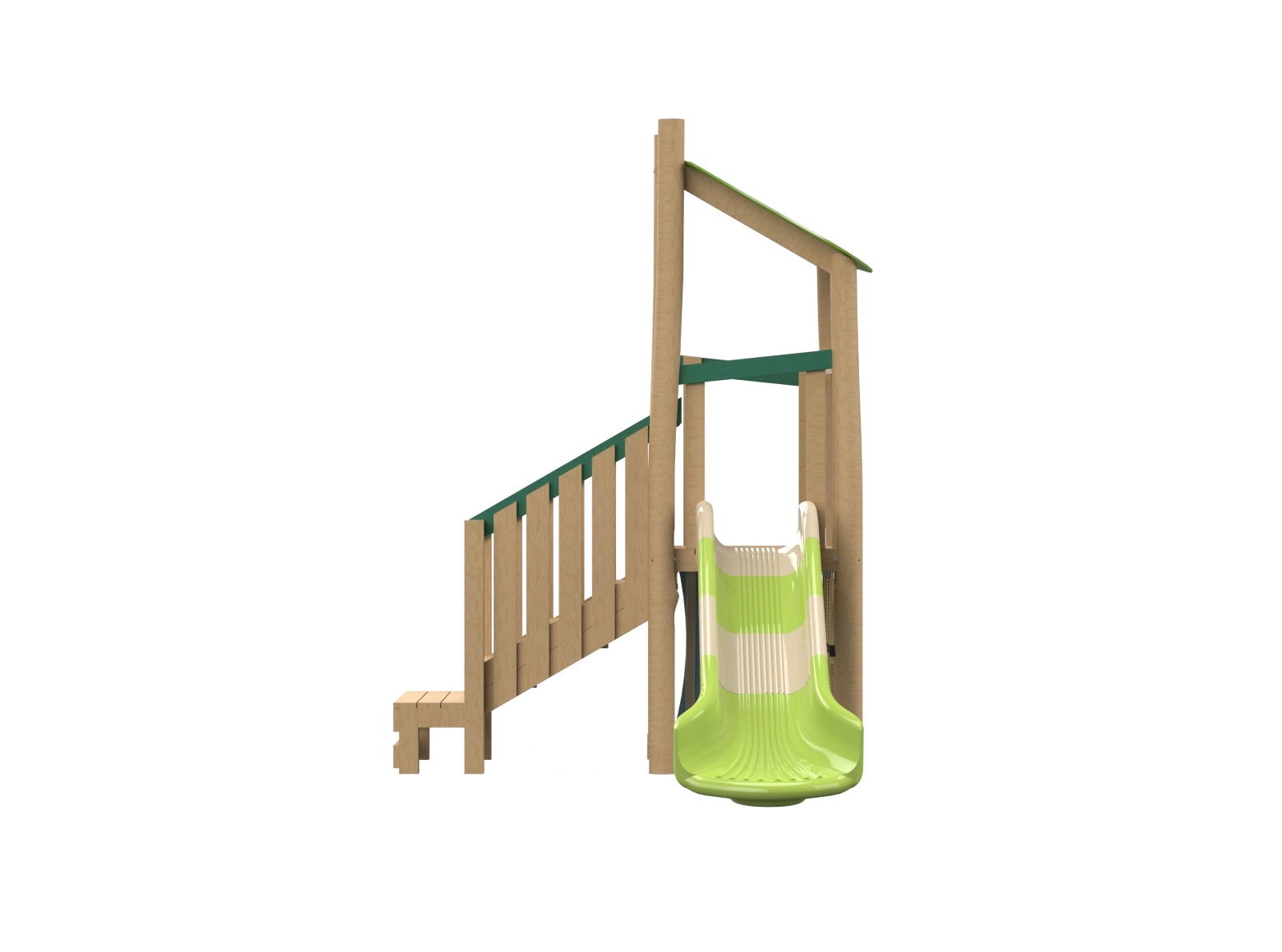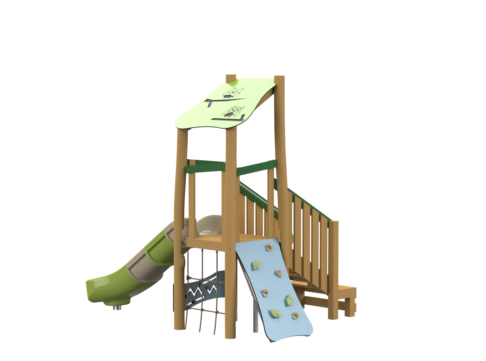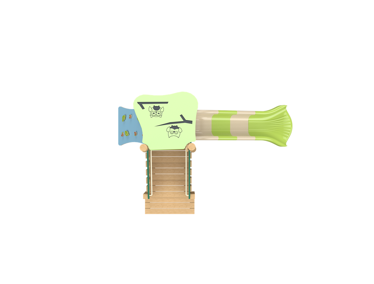 The Arpeggio play system combines natural European Robinia Wood with HPL panels, giving it a natural look alongside high durability. The system includes a straight jointed slide, cable climbing net, climbing wall with stepping stones, and accessible stairs, offering a variety of play options. The roof design adds an aesthetic touch, enhanced with cute owl carvings. The system is particularly suited for toddlers, allowing them to improve their climbing, sliding, and balance skills in a safe and enjoyable environment.