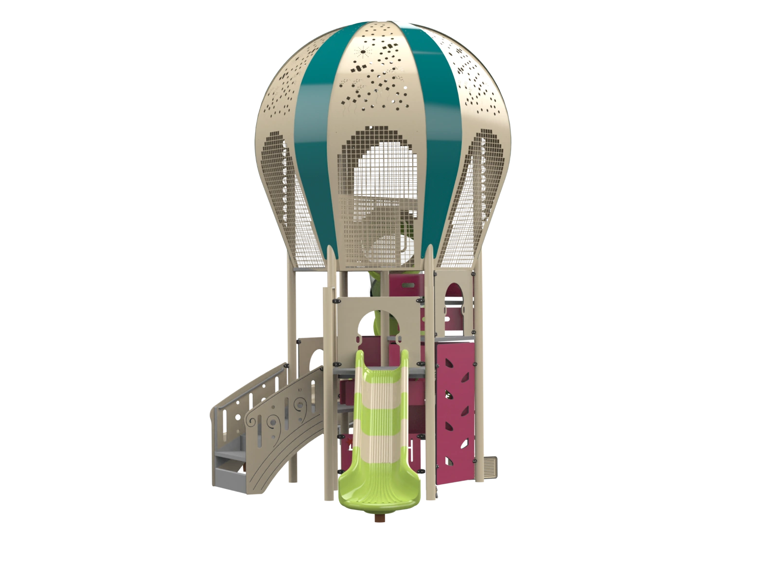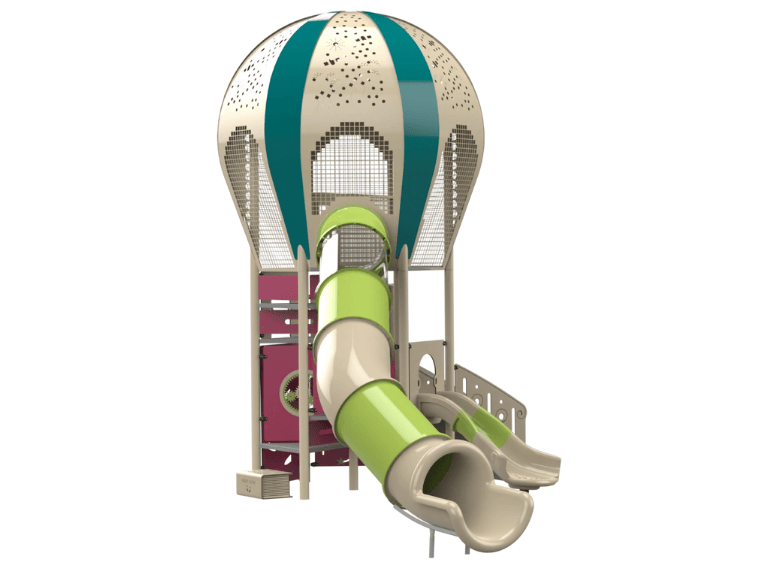 The Balloons 1 is designed as a magical hot air balloon. Its base is a multi level play system with 6 levels and includes a tube slide, a straight slide and a toddler slide, a climbing wall, a rope ladder for climbing, accessible stairs, a balcony, and 2 play panels. At the top of the structure is a giant hot air balloon dome. The play system is suitable for imagination and journey games and for physical activities such as climbing, movement, and sliding. It develops curiosity and creativity through the special design experience, and spatial perception, orientation, and motor control through the rich internal designs.