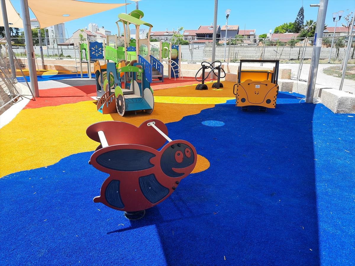 Bee-shaped bench for two. The bee figure is made of galvanized, rolled, and painted metal with HDPE siding. The rocking experience that the spring allows is beloved by young children due to the rhythmic and cyclical movement, and many children integrate role-play of galloping and dashing into the experience.