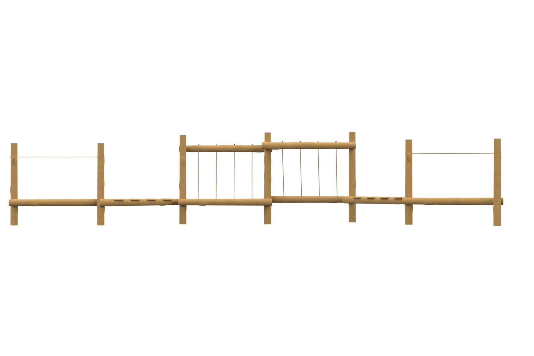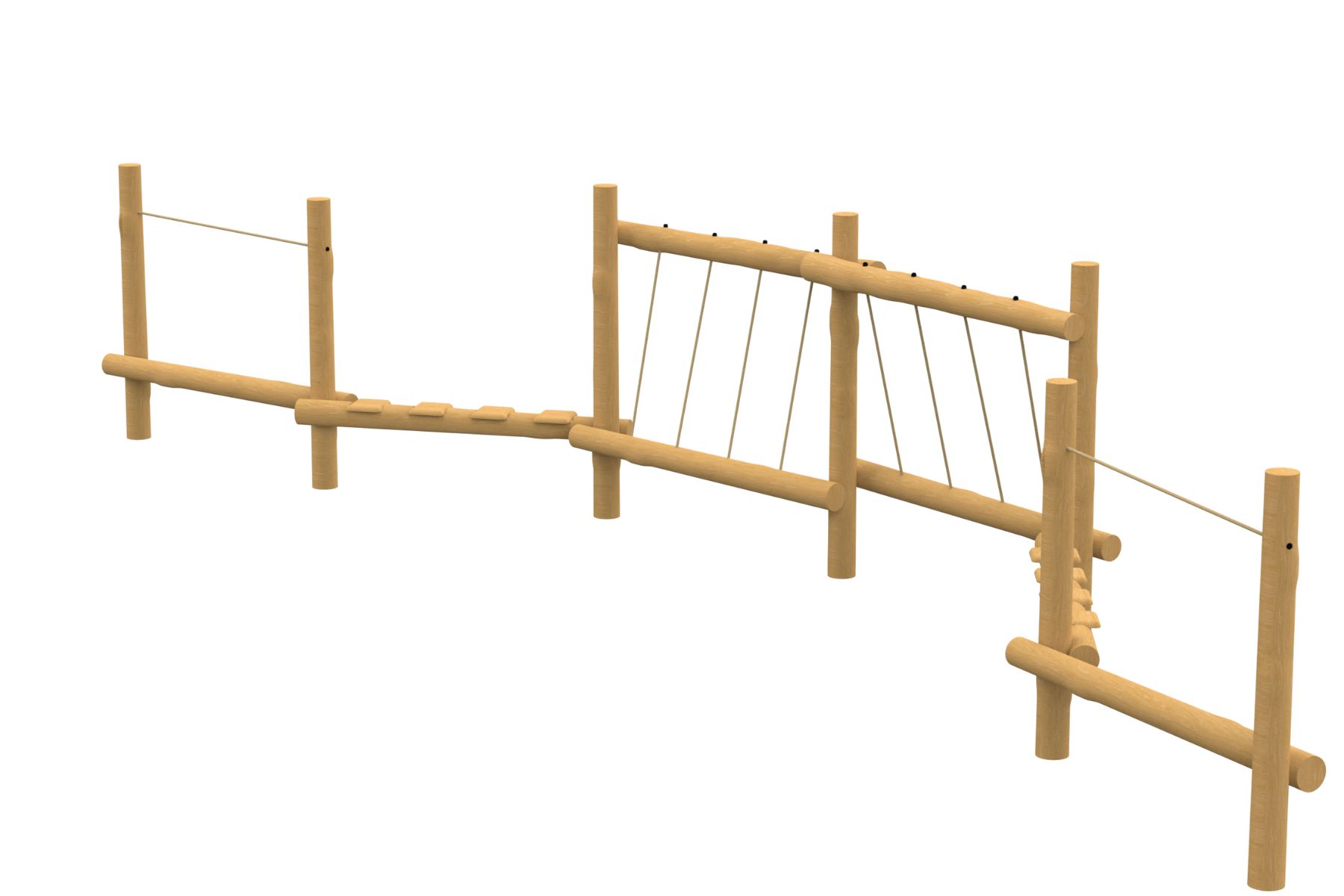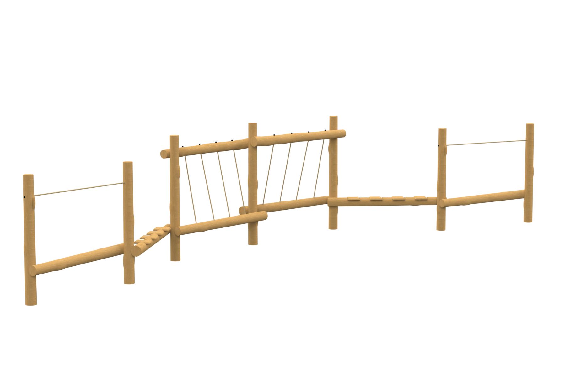 The Calypso course combines natural Robinia Wood with polyamide-coated handhold cables and footpaths that allow safe movement at varying heights. The structure encourages children to develop their stability and coordination while enjoying a fun and challenging climbing experience. The natural design blends well into outdoor spaces and invites children to explore and tackle new challenges.