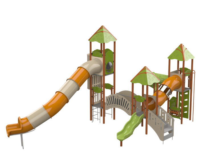 The heart of the playground is a central play system that combines multiple climbing, play, and sliding elements and can accomodate a large number of players simultaneously. The Chicago play system encourages imagination development games, physical development, social intelligence development, curiosity and exploration, independence, spatial orientation, stage planning, and proper organization.