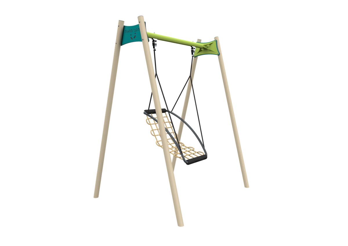 This swing is a rope seat swing that meets accessibility standards and is suitable for those with special needs. The swing seat supports and stabilizes the user in an upright, seated position, while the base anchored to the ground ensures that the swinging motion is limited so as not to destabilize the user.