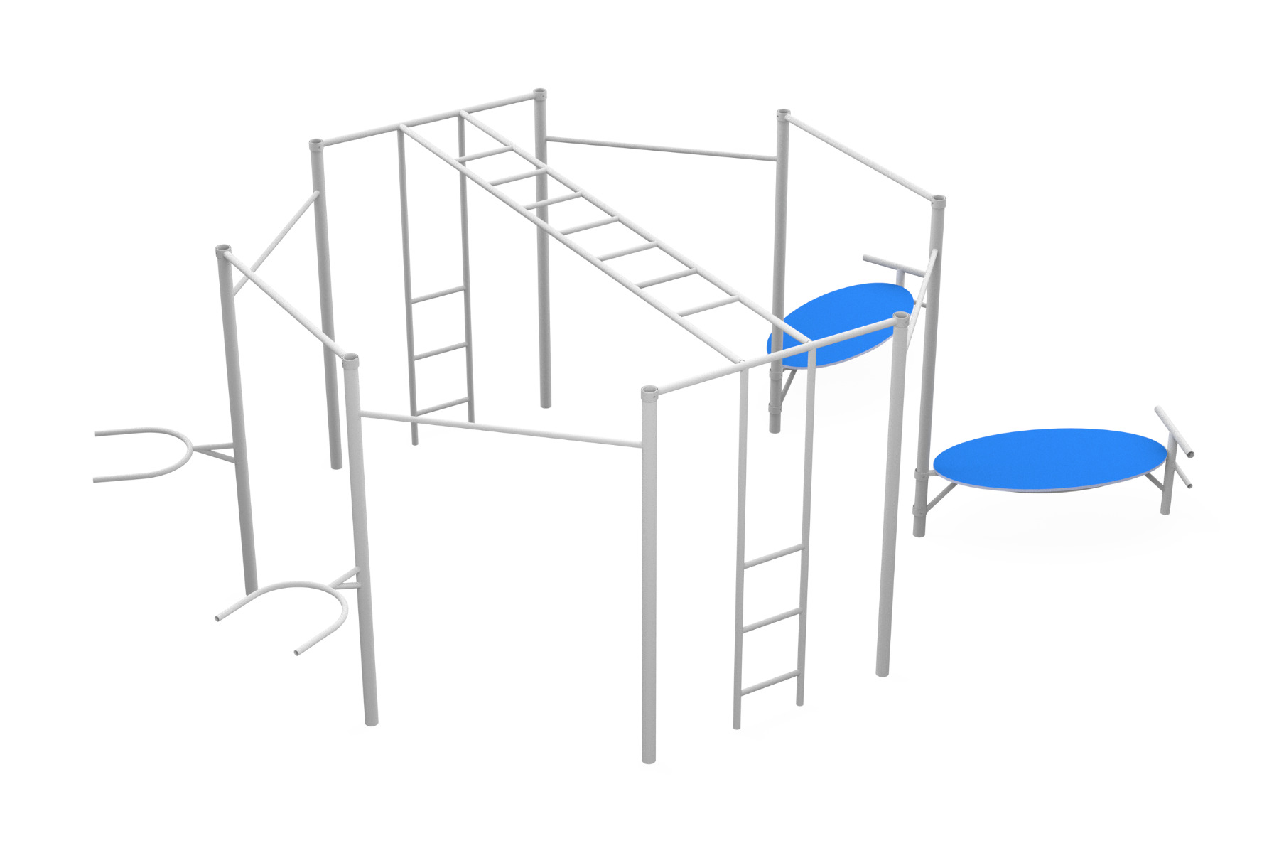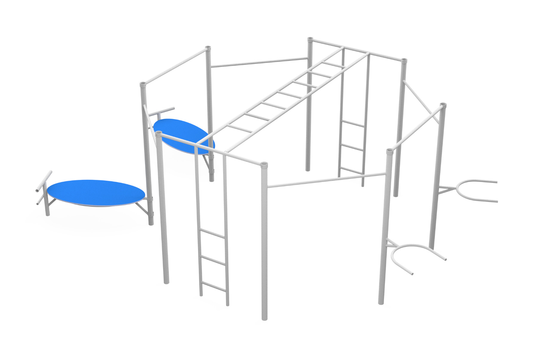 The Complex fitness station is a unique training structure designed for advanced physical and combat fitness development. The structure includes several courses and various elements, allowing children and teenagers to train their muscles, improve their strength, endurance, and balance, all while facing a dynamic physical challenge. The octagonal design creates a dynamic and varied workout experience, where users can transition between climbing, gripping bars, and maneuvering through different sections. This structure is suitable for playgrounds or outdoor sports areas and encourages users to improve their fitness in an enjoyable and challenging manner. The Complex fitness station is made from durable, high-quality materials, ensuring safe use and long-lasting durability.
