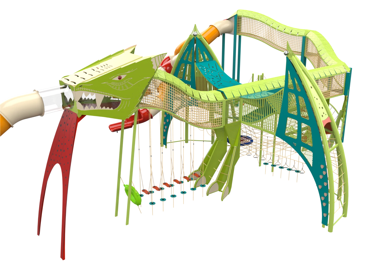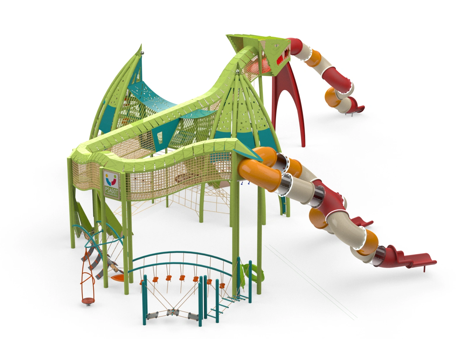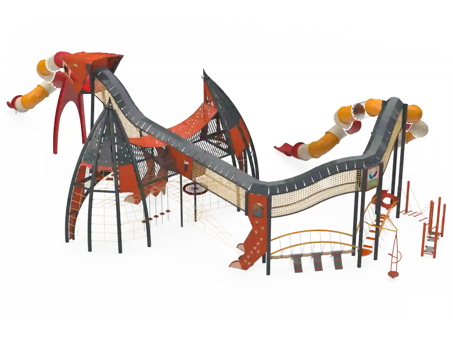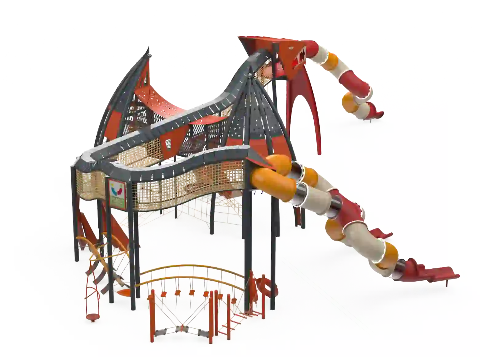 The Dragon structure is a unique play system designed as a giant, powerful dragon, leading children into a spectacular fantasy world full of adventures and challenges. The massive dragon, with its impressive rope bridges and winding slides, invites children to enter its belly, explore its mysteries, and face a variety of dynamic physical challenges. At the center of the structure stand sturdy rope bridges that form the dragon’s central spine. Each wing is designed as a challenging rope pyramid, and each leg includes climbing walls with stepping stones. The dragon’s mouth, made of transparent polycarbonate, adds an extra dimension of imagination, from which a winding slide emerges. Its enormous wings are integrated with play elements such as rubber hammocks, swinging bridges, and transparent crawling tunnels, and of course, many slides.