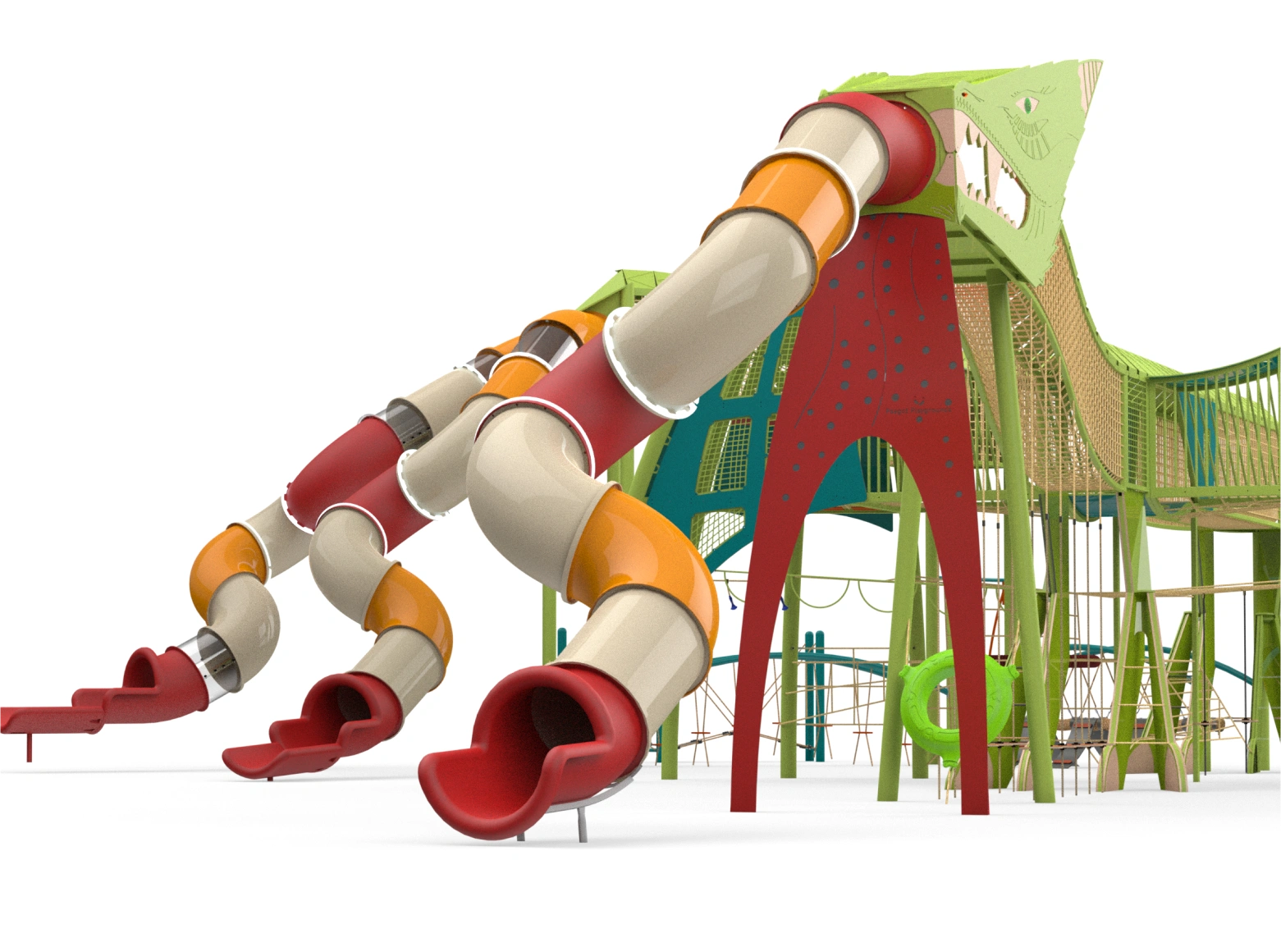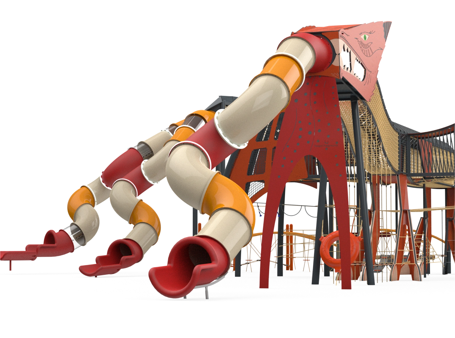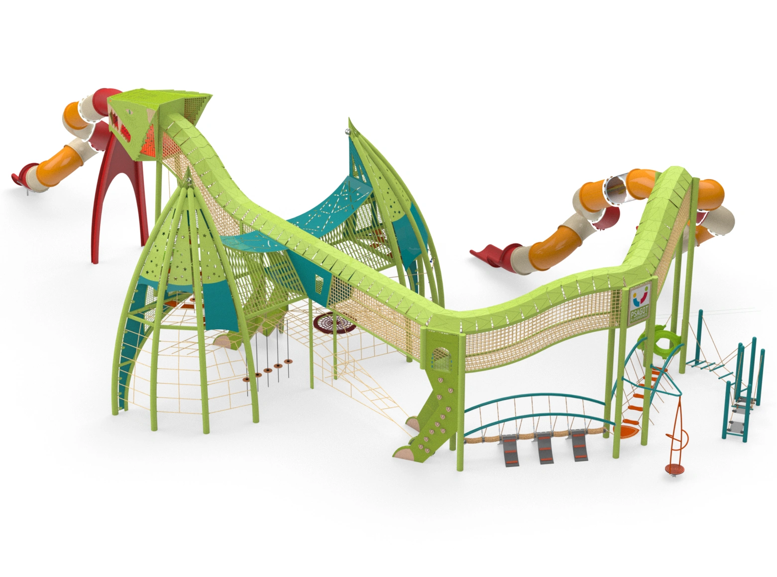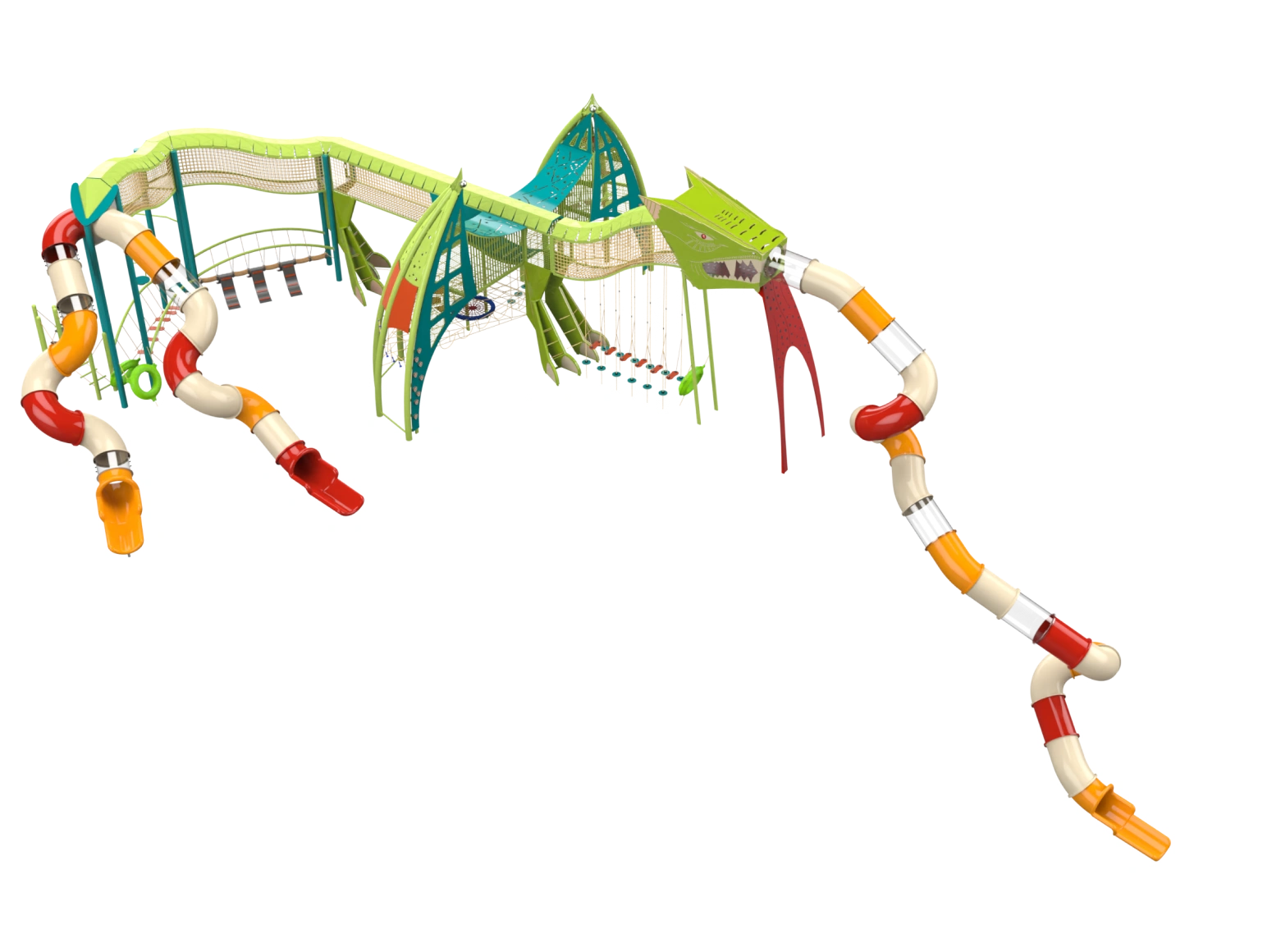 The Dragon structure is a unique play system designed as a giant, powerful dragon, leading children into a spectacular fantasy world full of adventures and challenges. The massive dragon, with its impressive rope bridges and winding slides, invites children to enter its belly, explore its mysteries, and face a variety of dynamic physical challenges. At the center of the structure stand sturdy rope bridges that form the dragon’s central spine. Each wing is designed as a challenging rope pyramid, and each leg includes climbing walls with stepping stones. The dragon’s mouth, made of transparent polycarbonate, adds an extra dimension of imagination, from which a winding slide emerges. Its enormous wings are integrated with play elements such as rubber hammocks, swinging bridges, and transparent crawling tunnels, and of course, many slides.