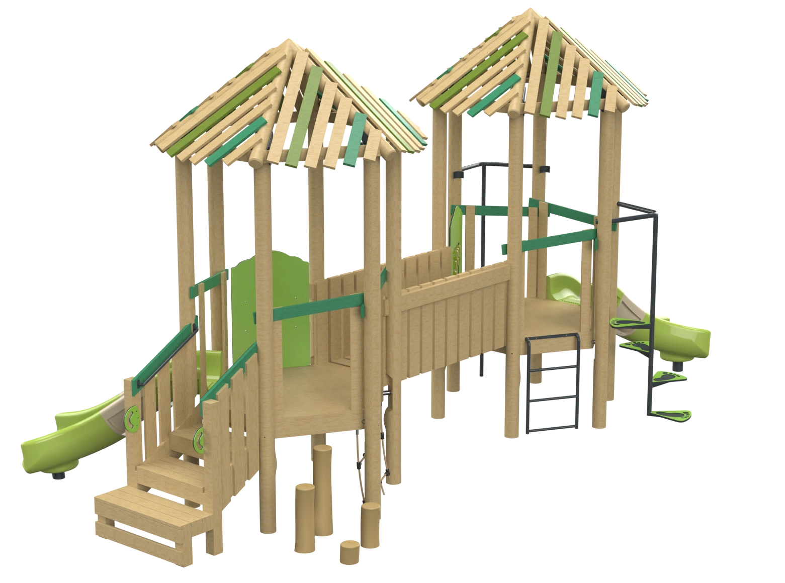 The Espresso model is a combined play system made from Robinia Wood, featuring two towers connected by a bridge. The system includes slides, climbing elements, and other play activities suitable for children of various ages. The natural Robinia Wood design blends wonderfully into green environments, providing children with a sense of adventure while developing motor skills, balance, and coordination.