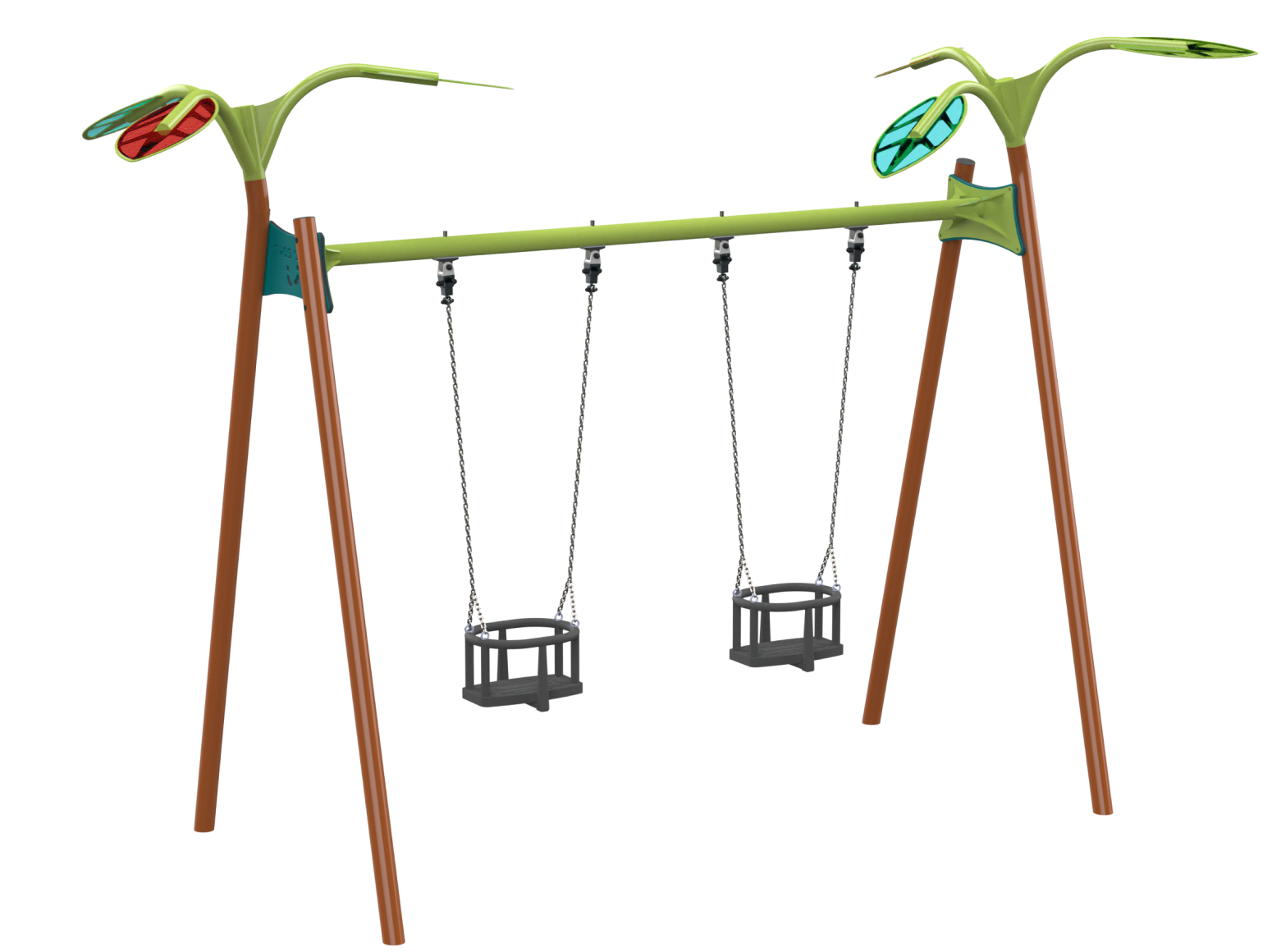 The swing set is one of the central and most beloved structures in any playground, offering a unique play experience that combines a sense of freedom, exhilaration and social interaction. Swinging provides children with a sense of excitement but can also be calming, all while helping to develop important motor skills such as balance and coordination. A double-seat swing set with two toddler seats from the Forest series, its design is inspired by nature, with colorful leaf crowns made of semi-transparent polycarbonate that add a magical and unique dimension to the playset.