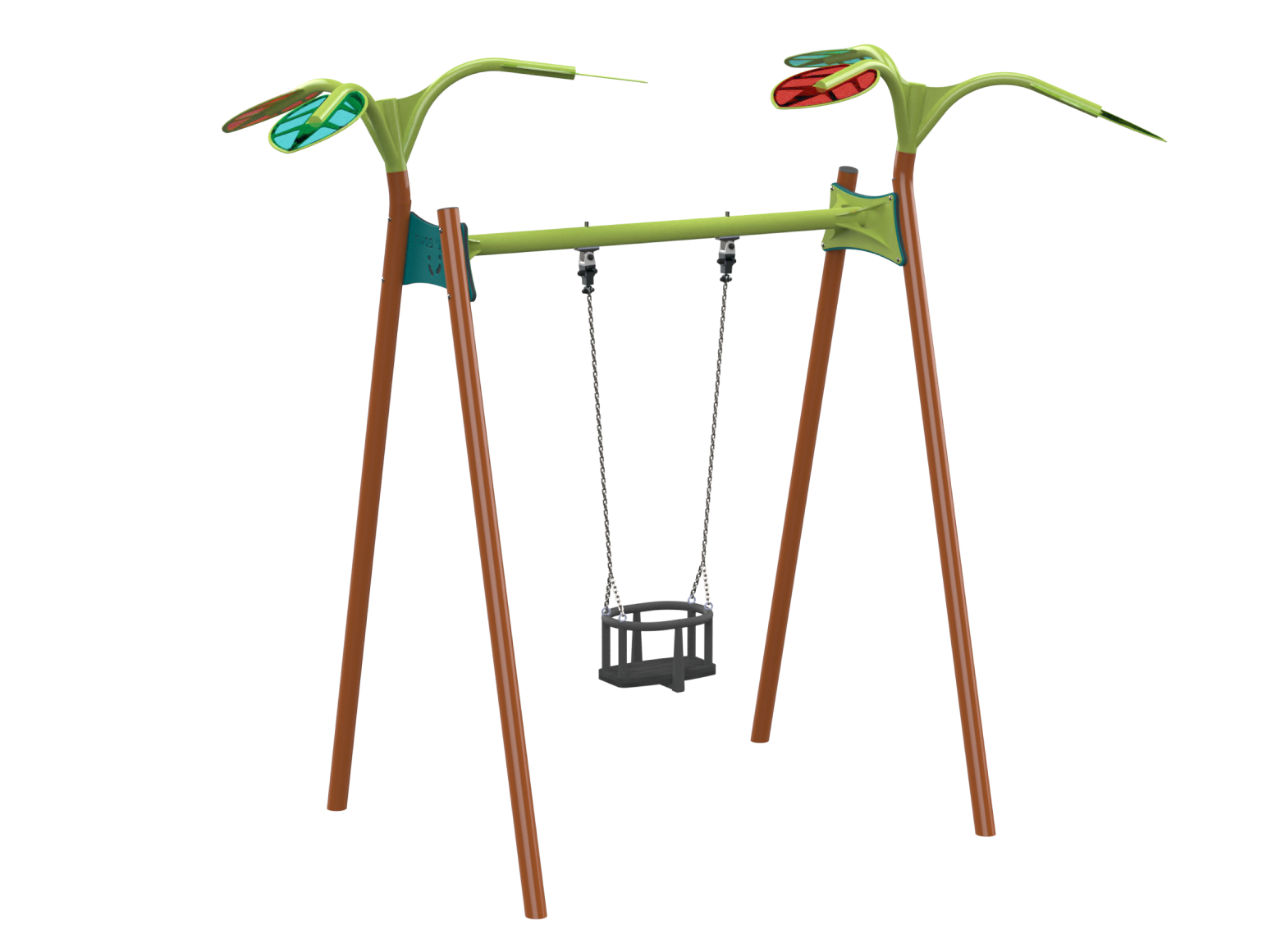 The swing set is one of the central and most beloved structures in any playground, offering a unique play experience that combines a sense of freedom, exhilaration and social interaction. Swinging provides children with a sense of excitement but can also be calming, all while helping to develop important motor skills such as balance and coordination. A metal frame with a toddler seat: a rubber seat designed in a closed structure with a leg divider for safe use by young children. Suitable for seated infants up to the age of three. Designed as part of the Forest series, inspired by nature, with colorful leaf crowns made of semi-transparent polycarbonate that add a magical and unique dimension to the swingset.