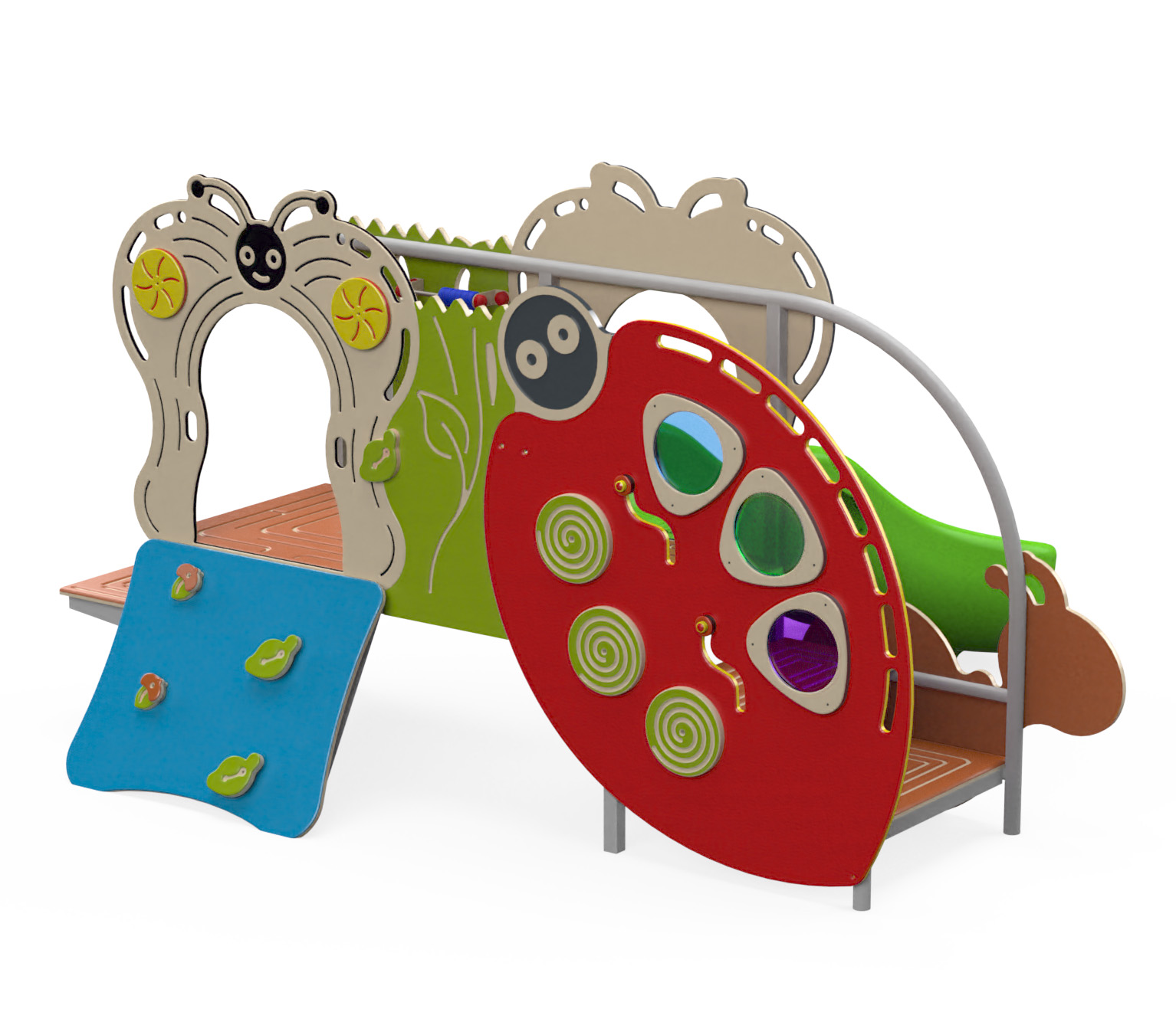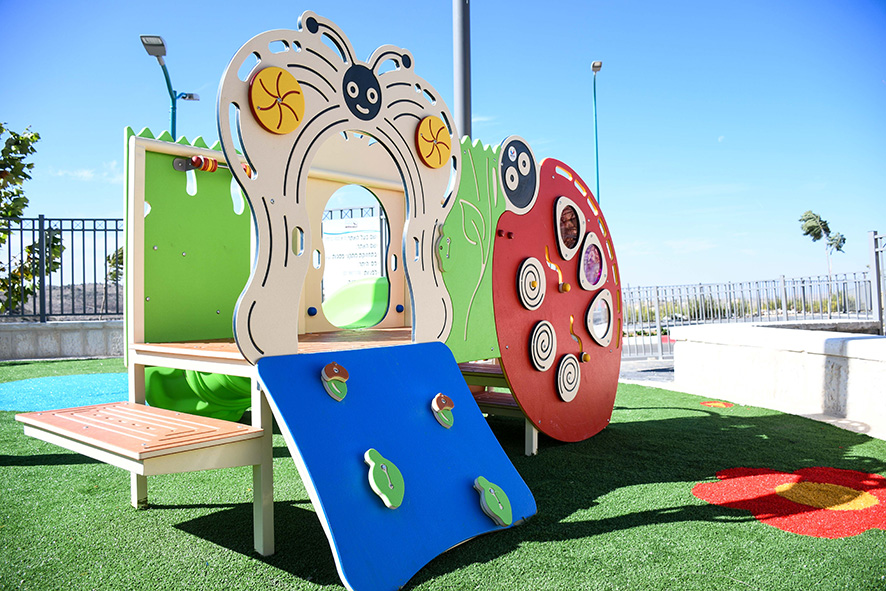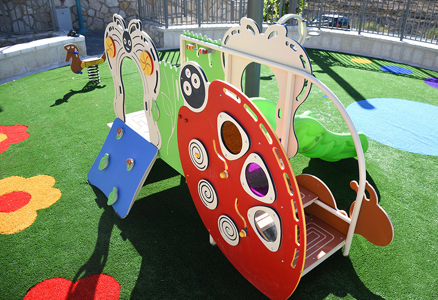 A toddler playset made of HDPE designed with elements from the Seven Species. Includes stairs leading to a play surface, a climbing wall and slide, as well as rotating games.