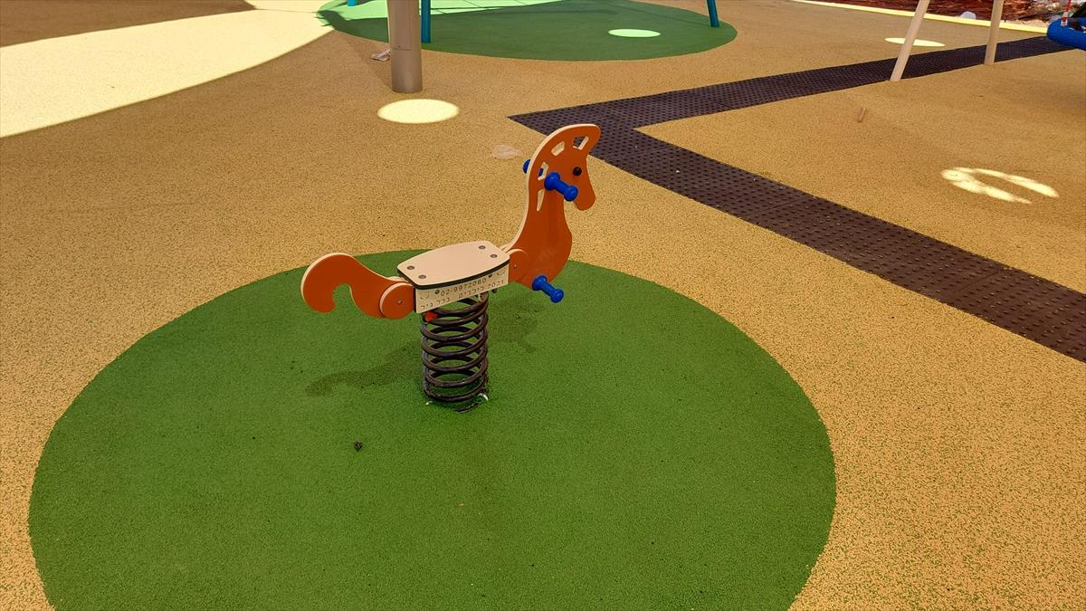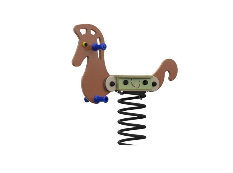 Single seat HDPE horse with a galvanized, rolled, and painted metal spring at its base. The rocking experience that the spring allows is beloved by young children due to the rhythmic and cyclical movement, and many children integrate role-play of galloping and dashing into the experience. The use of the equipment is suitable for one child at a time, so children also gain an important lesson in delayed gratification while waiting for their turn and in consideration for others when using the equipment.