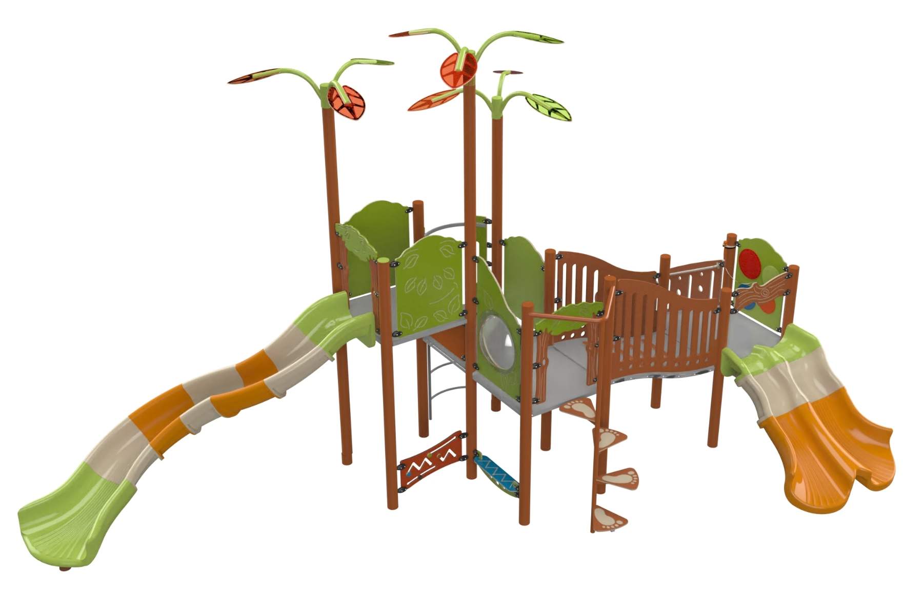 A designed and accessible combined structure including multiple climbing, play, and sliding options and containing a large number of players simultaneously. With accessible stairs, a spiral step climbing element, and a steel ladder, straight, sloped, and tiered play surfaces, game boards and a musical board, a curved segment slide, and a double straight slide to enhance the play experience. The structure is adorned with colorful petals. Suitable for imagination development games, physical development, and social intelligence development. Encourages curiosity and exploration, independence, spatial orientation, stage planning, and proper organization.