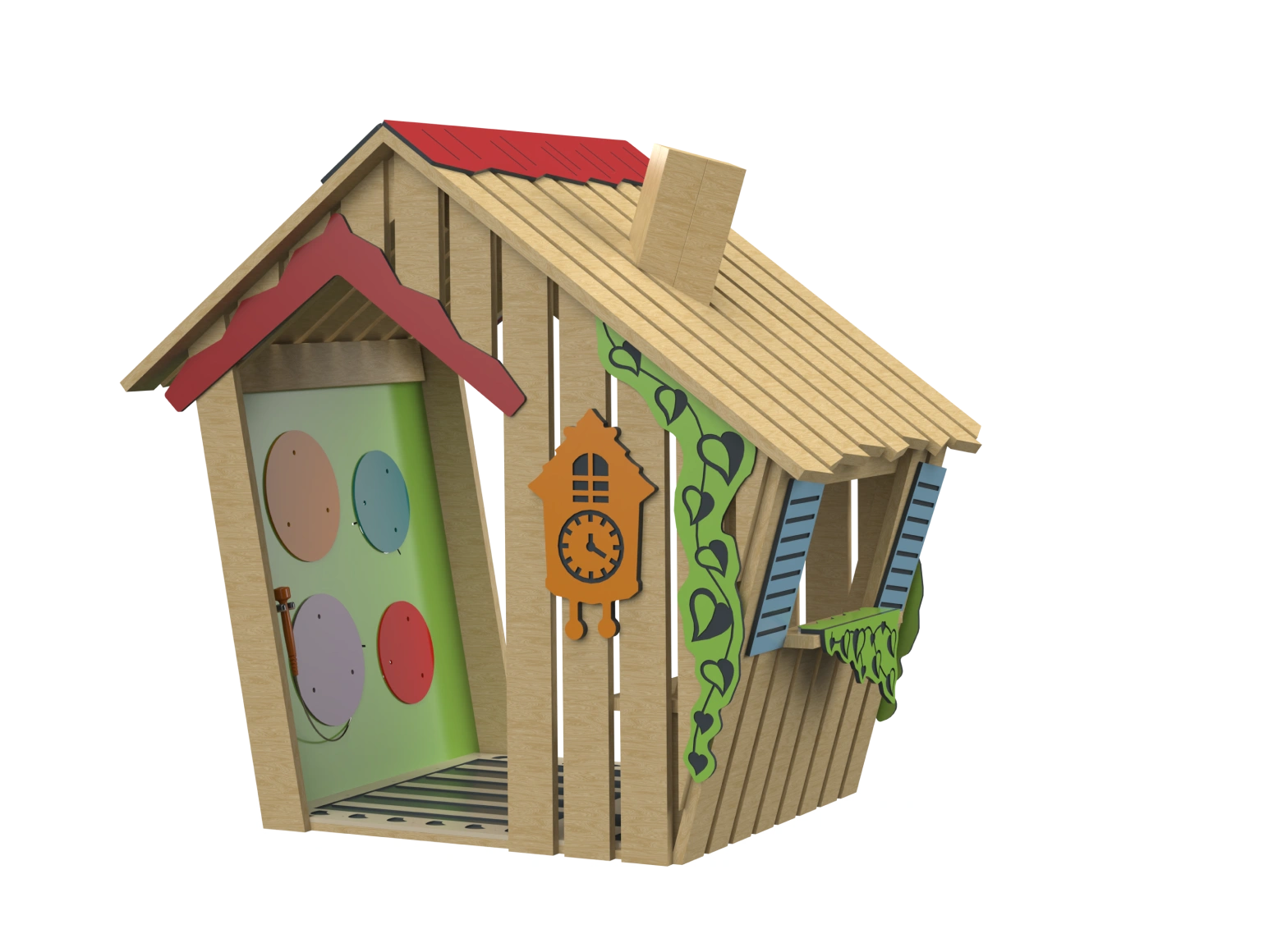 The Jungle House invites children into a charming cabin made from natural Robinia Wood, featuring colorful HPL panels. Inside the cabin, there is an engraved activity board to stimulate imagination and a xylophone for musical play. A comfortable bench allows children to enjoy moments of rest and cooperation. The design encourages exploration and free play, providing a space where children can nurture their creativity and imagination in a safe and enjoyable environment.
