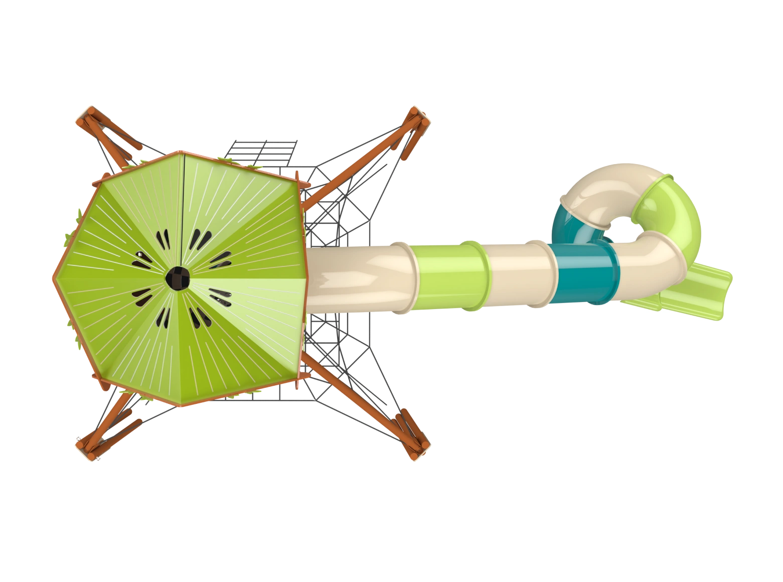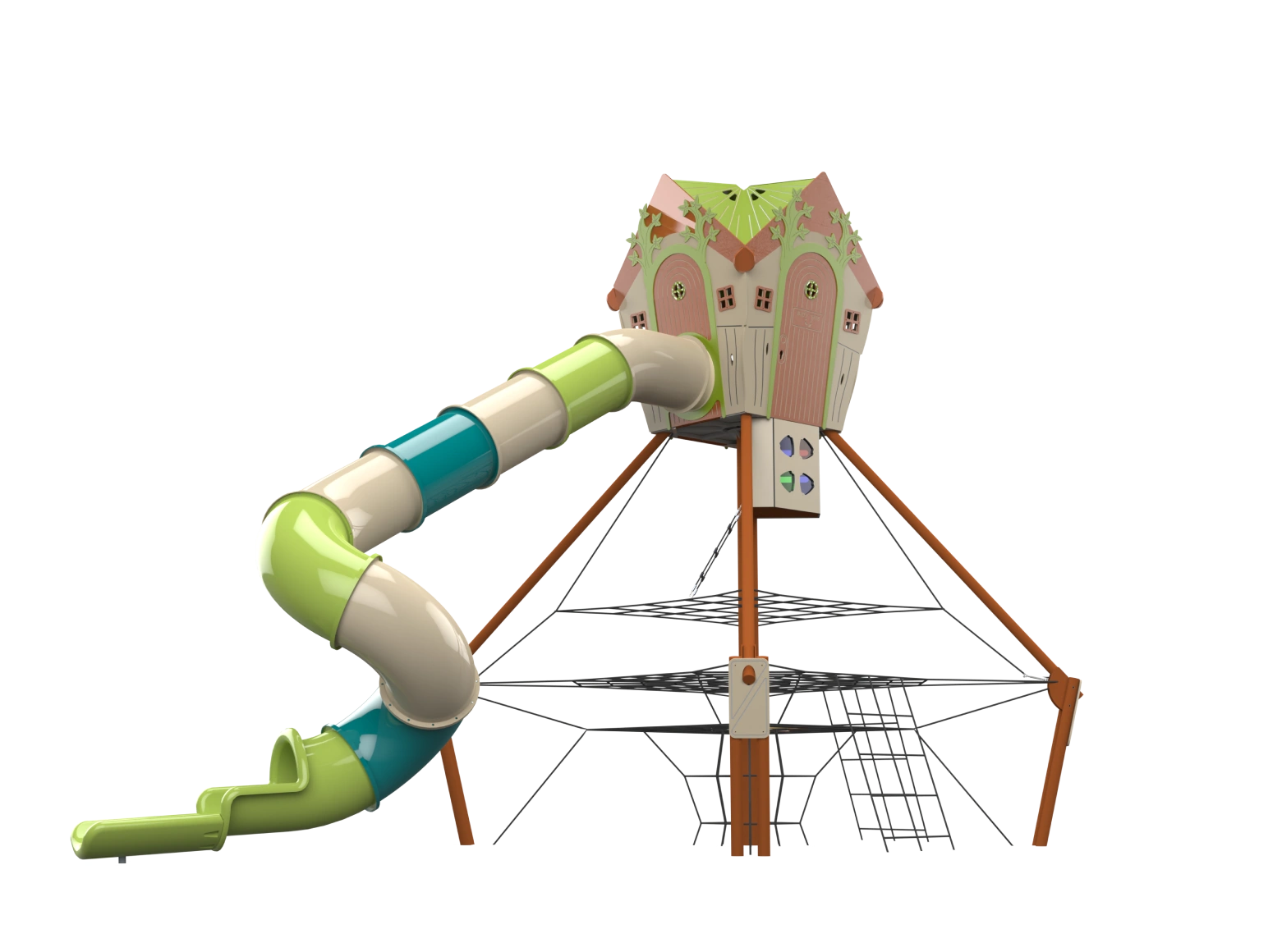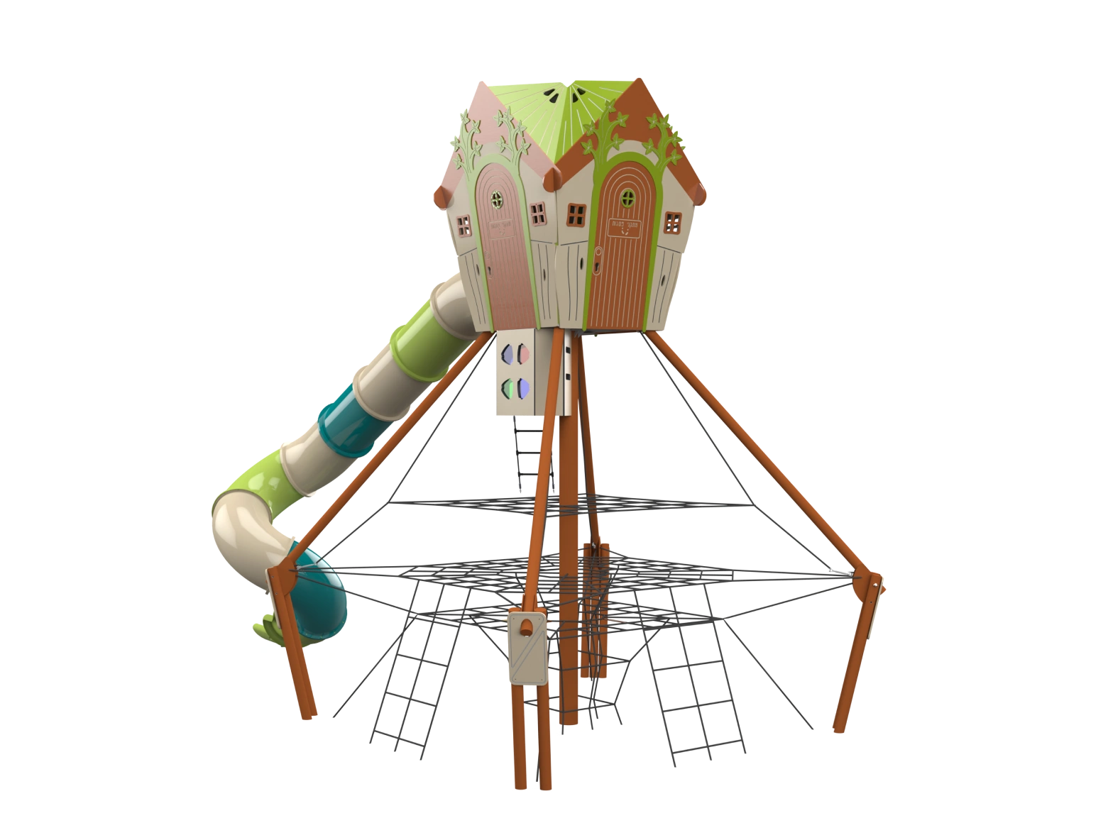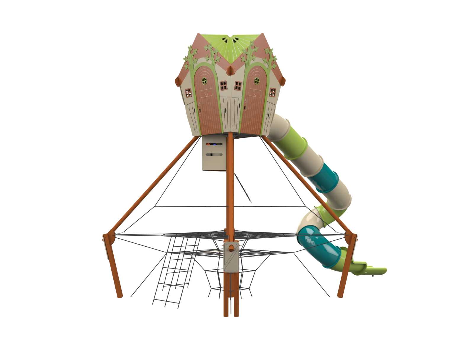 The Long Beach 1 AA is an extreme play structure, made of steel, cables, and HDPE/HPL. Climbing to the cabin is done using an intricate rope system. The descent is via a long corked tube slide. The cabin has three rounded windows that provide an open view and allow supervision and accompaniment from outside the structure.