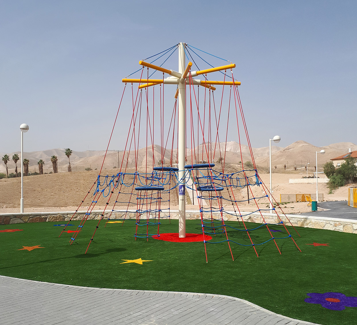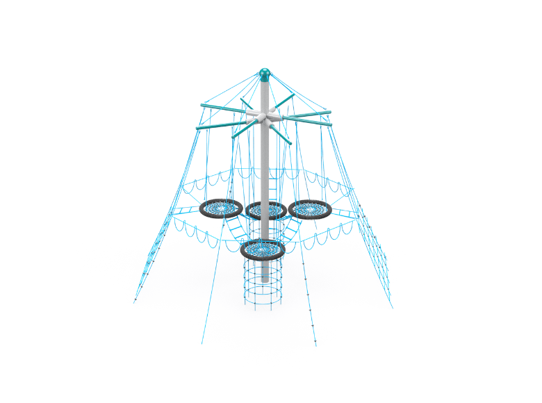 The Mars is a challenging pyramid-shaped climbing structure standing at 6.5 meters tall. The structure includes ropes and ladders with hand and foot holds. At its center, 4 cable discs with a diameter of 1.22 m are attached. Suitable for games that develop imagination, physical development, and social intelligence. Encourages curiosity and exploration, independence, spatial orientation, stage planning, and proper organization.