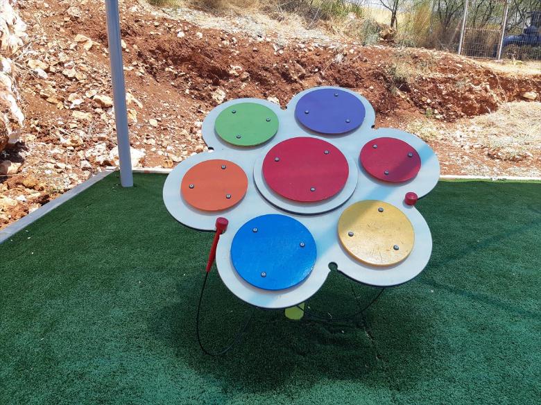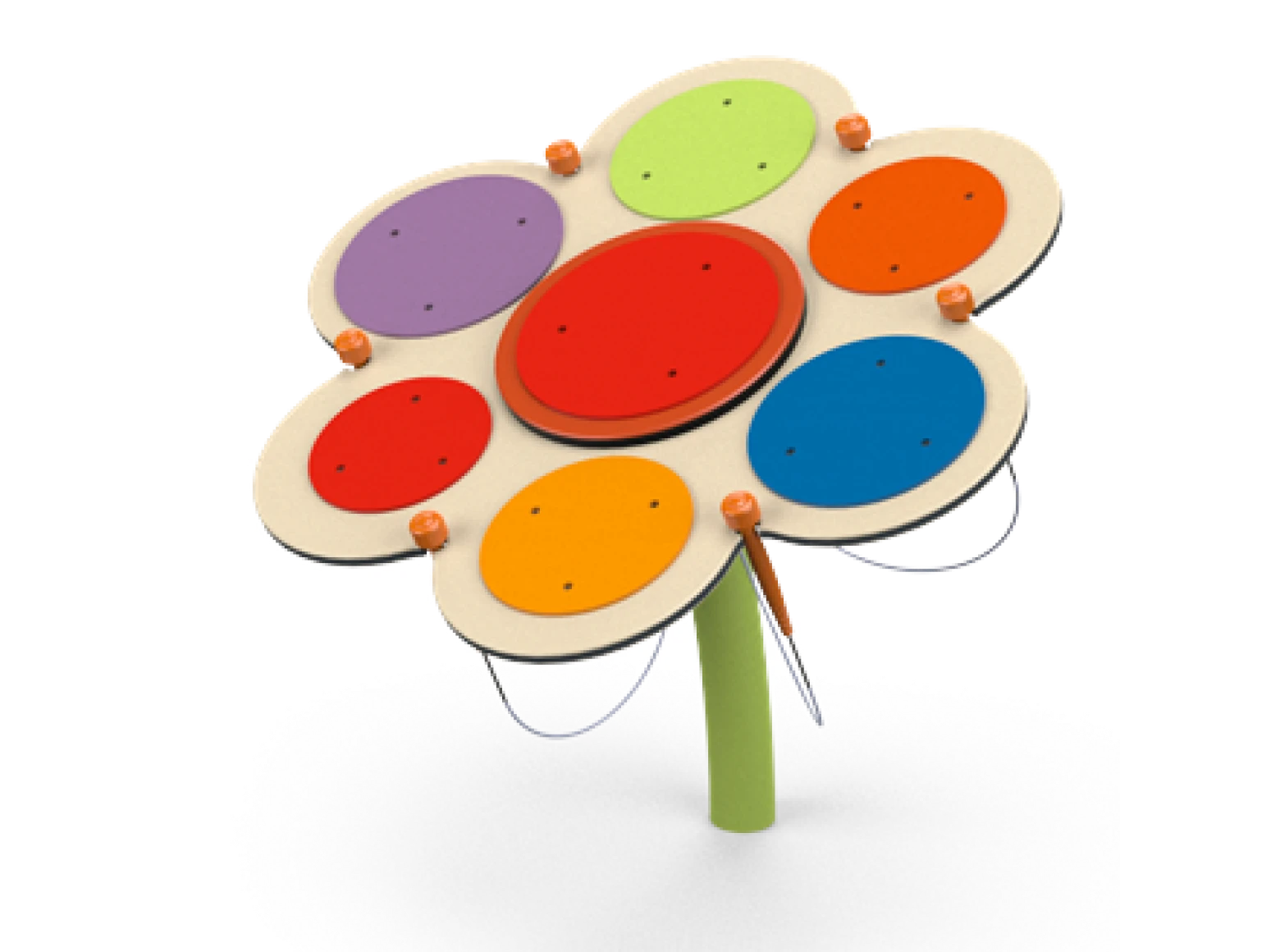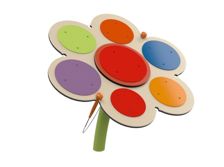 In the Musical Flower, sound is visually represented. Each color produces a different note, and together, they create a beautiful harmony. The sound plates produce a powerful resonance due to their round shape. The round sound plates match the shape of the sound wave, vibrating strongly at the edge, resulting in a clear and pure sound.