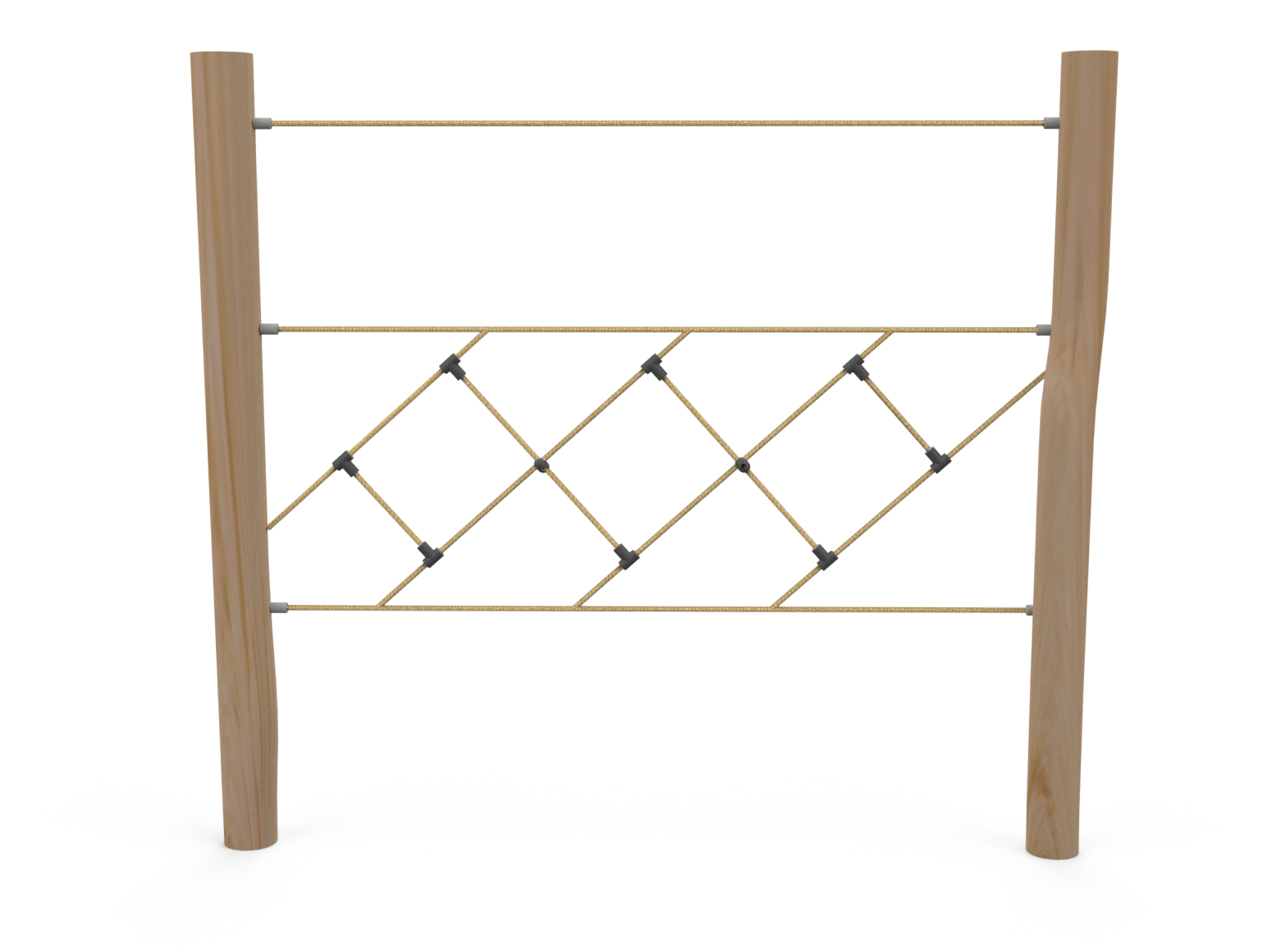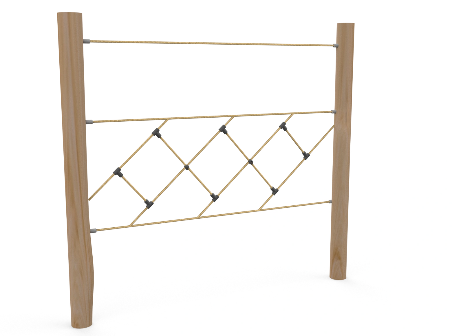The Richmond-San Rafael Bridge B structure is made from European Robinia wood and is part of the Big Four Bridge challenging ropes course . It features two stable wooden posts connected by a diagonal climbing net made of ropes, aimed at climbing and balance challenges. The structure encourages users to move in a controlled manner through the net, enhancing coordination, arm strength, and balance. This structure can stand independently, providing a unique and challenging climbing experience for children and youth.