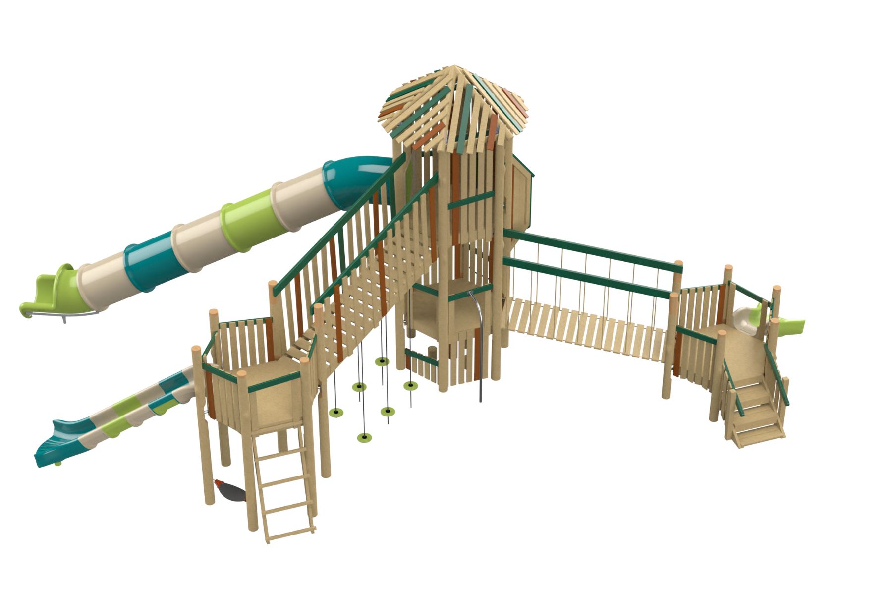 The Skyland equipment is made from natural European Robinia Wood, adding a warm and natural look to any environment. The equipment blends pleasantly into its surroundings, with a subtle color scheme that fits well in public spaces. The equipment includes a variety of elements such as climbing, sliding, and bridge crossing, allowing children to experience a range of physical activities and challenges.
