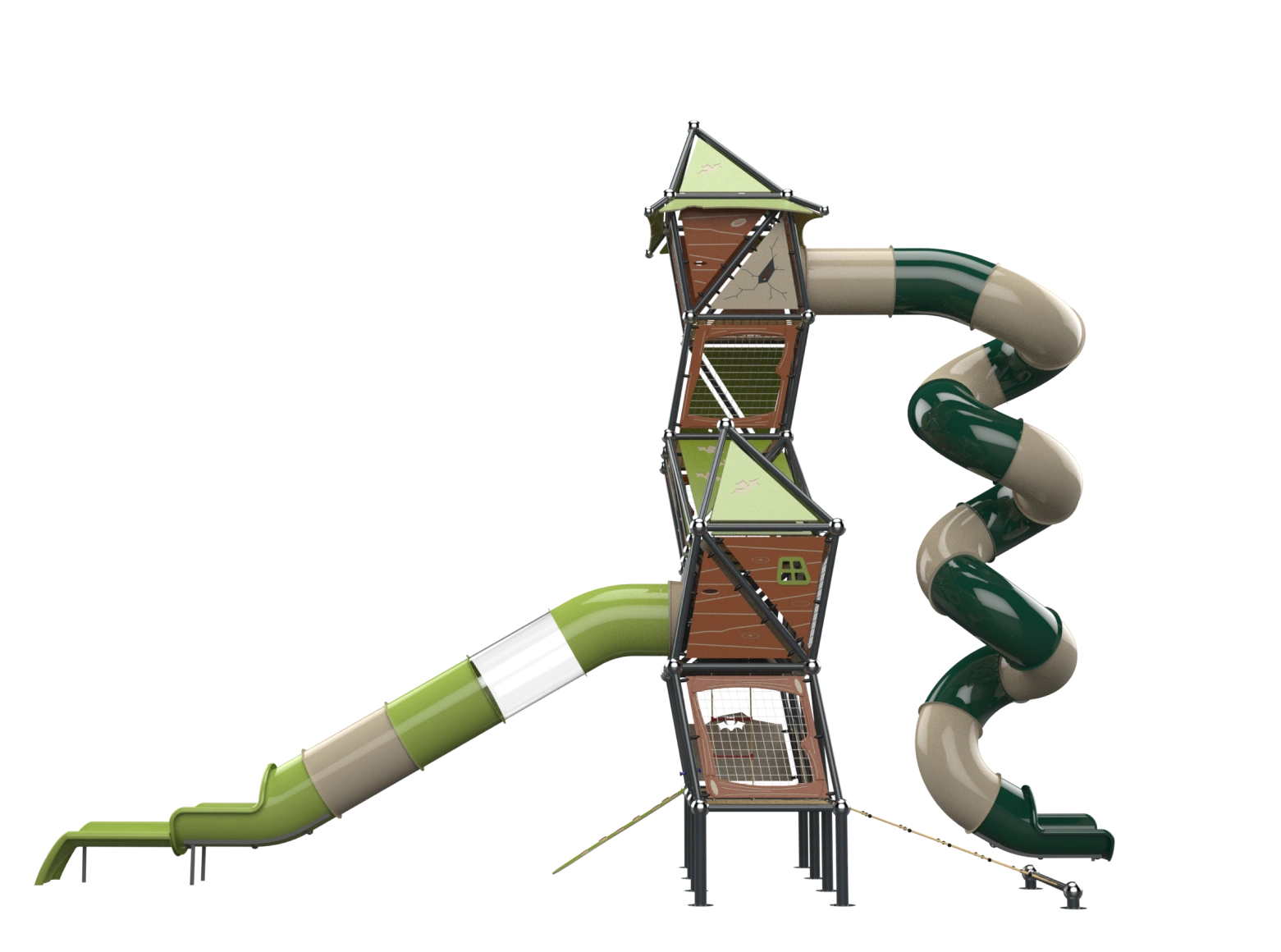 The Whitch House is a sloppy style play structure that breaks conventions, with a disheveled appearance, seemingly crooked and broken, and with elements from fairytales. The top of the strucuture rises to a height of 9.15 meters. Users can climb the structure using a cable net or climbing wall and descend via a corked tube slides. The interior of the structure consists of broken half-floors challenging players to find their way to progress in the space. The half-floors are built in different shapes, adding challenge and interest.